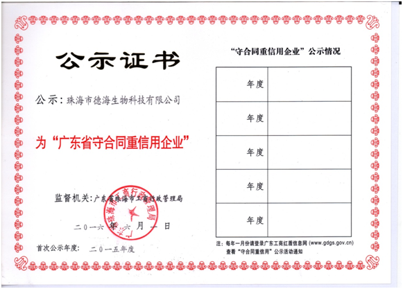 2016年6月,我司被广东省珠海市工商行政管理局授予 :2015年度“广东省守合同重信用企业”荣誉称号。我司自成立以来,始终坚持“品质如金,质量求恒”的质量理念,以“诚信经营、诚信共赢”为宗旨,以顾客至上,优质服务为导向,视诚信为立身之本、发展之基、信誉之源,以共赢为目的经营企业。公司多年来严格按照《合同法》以及相关的法律法规履行合同,获得各代理商、供应商和广大客户的一致好评和赞誉。这次市工商行政管理局对我司授予“守合同重信用企业”称号,正是对我司的肯定,更是对我司的一种鞭策。