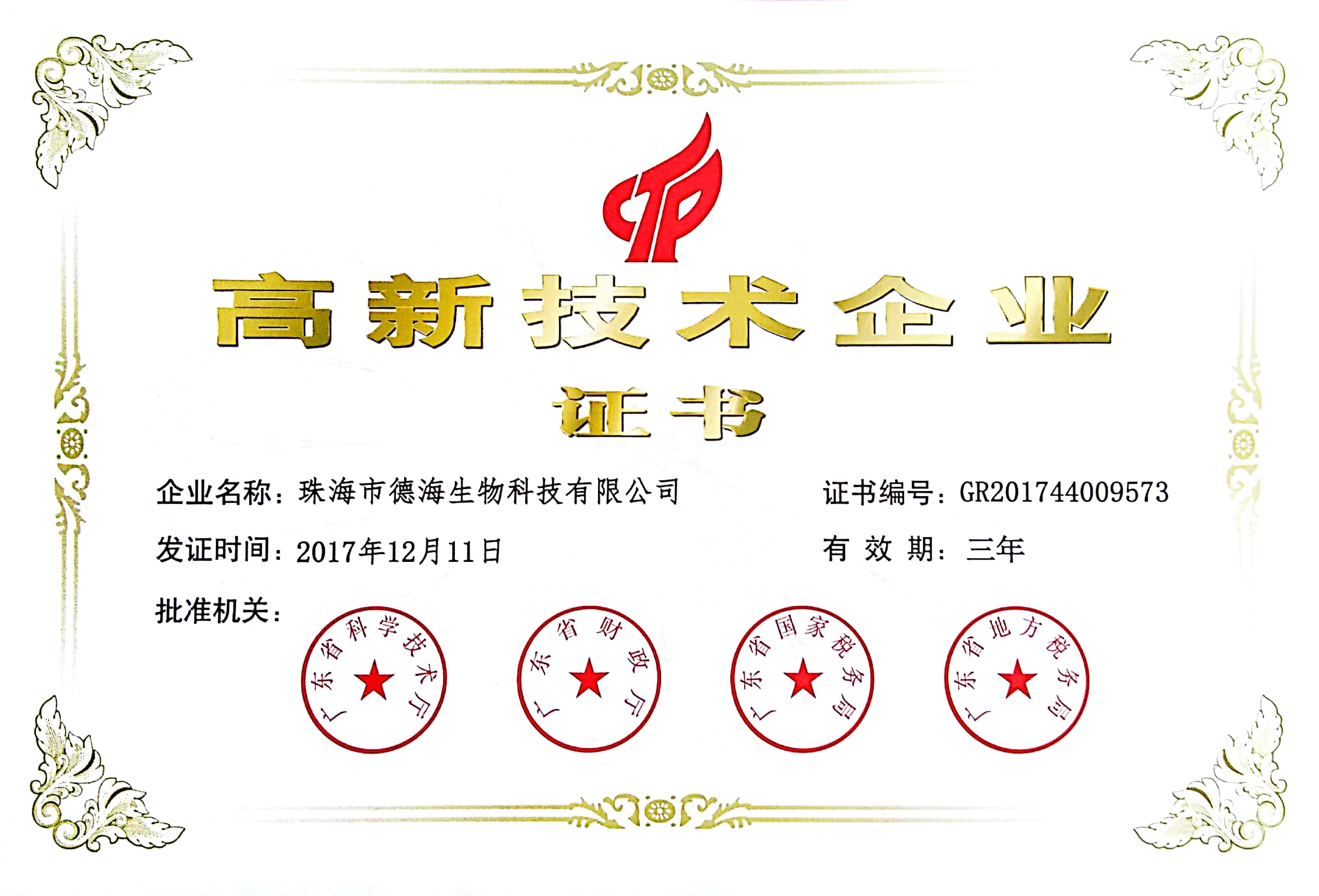 2018年5月2日,珠海市德海生物科技有限公司喜获通知(以下简称“公司”),可以领取广东省2017年度高新技术企业资格认定第一批证书,(证书编号:GR201744009573),该证书由广东省科学技术委员会、广东省财政局、广东省国税局、广东省地税局联合颁发。此次评选经过严格的测评和审批程序,通过企业申报、地方初审、专家审查、国家复审、公示等严格程序认定,公司最终获批成为国家高新技术企业,这标志着公司凭借专业的研发队伍、雄厚的技术实力、持续的创新能力、规范的企业管理,在高新技术服务行业的成就得到国家相关部门的肯定与认可。今后公司将极大推动自主创新、自主研发的进程,着力加大科研投入、培养人才队伍来构筑全新的技术创新体系,为提升企业核心竞争力、充实企业创新发展后劲,为企业可持续发展提供强有力的技术支撑。