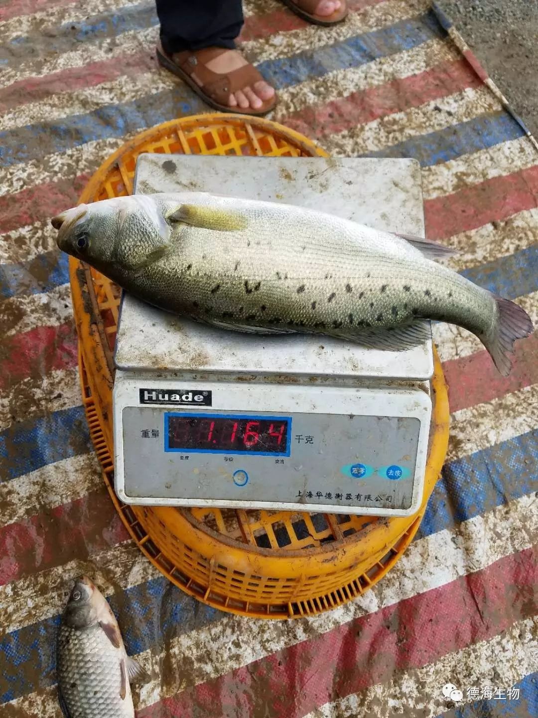 经销商梁*荣客户,2017年2月4日放海鲈苗, 2017年11月10日干塘,平均规格1.4斤/条,6成以上1.2斤/条,共抓鱼88000斤(不含死鱼),全程使用德海高海料普通料2750包(含鱼苗料),系数32斤/包,鱼身靓,背肉够,客户对效果非常满意!